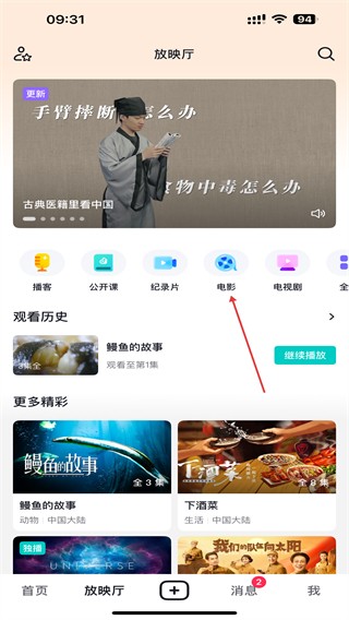 2、在放映厅的界面内,点击上方电影的标签。