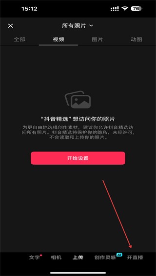 2、进入视频的界面内,点击右下角开直播的功能按钮。