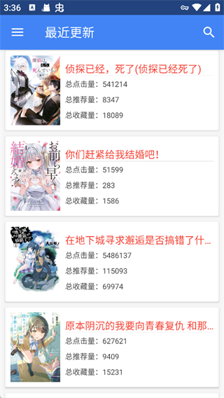 1、打开轻小说文库App后,即可在首页看到多部热门轻小说作品,并配有点击量、推荐量等数据,方便快速筛选感兴趣的内容。