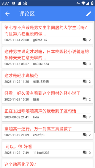 4、每本小说都内置评论区,读者可以查看大家对剧情、角色、题材以及动画化可能性的讨论,同时也能发表自己的观点,与其他轻小说爱好者互动交流。