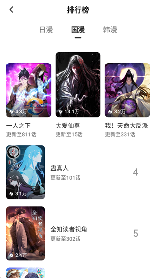 进入排行榜页面,可切换日漫、国漫、韩漫分类,页面清晰展示各地区热门漫画的封面、人气值和更新话数,能帮你快速筛选出对应地区的高人气作品,精准找到口碑佳作。